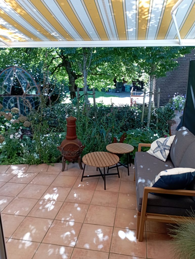 Sitzecke auf der Terrasse mit elektrisch ausfahrbarer Markise